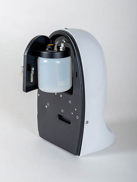 Bezdotyková dezinfekce D3 funguje na principu atomizace dezinfekčního prostředku. Díky této technologii a kompresoru se dezinfekční roztok roztříští na jemné kapičky, které se dostanou do všech částí rukou. Po vložení rukou do přístroje se proces atomizace automaticky spustí a dezinfikuje ruce tak dlouho, jak potřebujete. Funguje na baterii 12 V. Náplň můžete použít jakoukoliv dezinfekci.