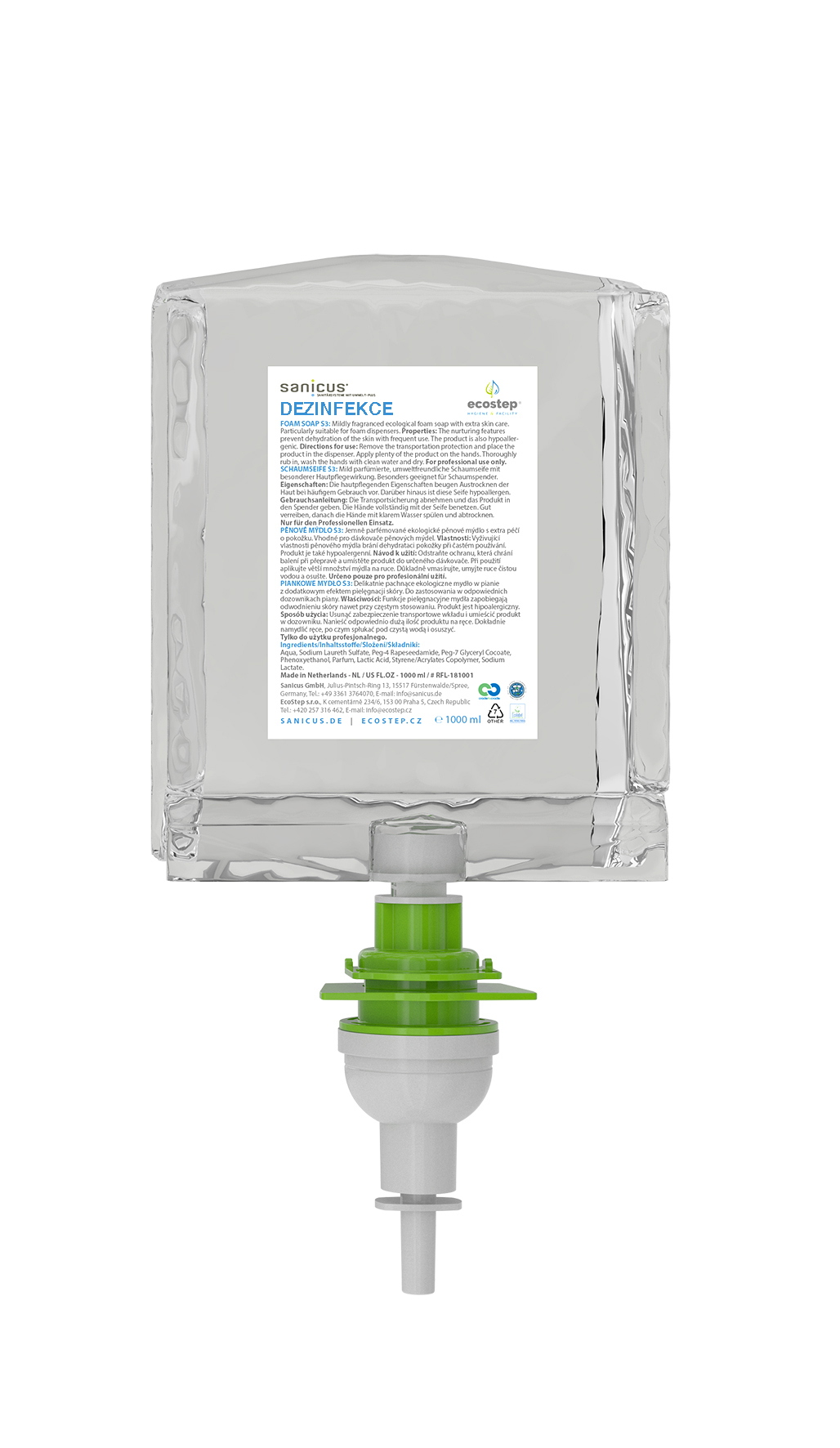 Malý a výkonný pěnový dávkovač dezinfekce ECOSTEP-S3 zaručuje vždy přesné dávkování nezávisle na stavu nabití baterií. Každý nový sáček má vlastní zpěňovač, což vždy zaručuje špičkový chod dávkovače. Speciální vakuové sáčky s dezinfekcí a přísadou zabraňují vysušení rukou a zaručují čistý provoz bez vytékání na umyvadlo nebo podlahu.