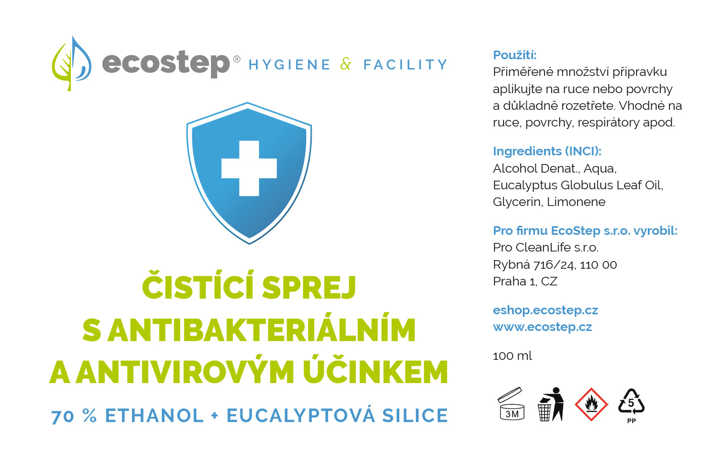 EcoStep čisticí roztok s osvědčeným antibakteriálním a antivirovým účinkem přípravků na bázi ethanolu šetrně pečuje o pokožku rukou a nevysušuje ji. Obsahuje přírodní eukalyptovou silici, která krásně voní. V praktickém balení ve spreji. Jedná se výhradně o ČESKÝ VÝROBEK.