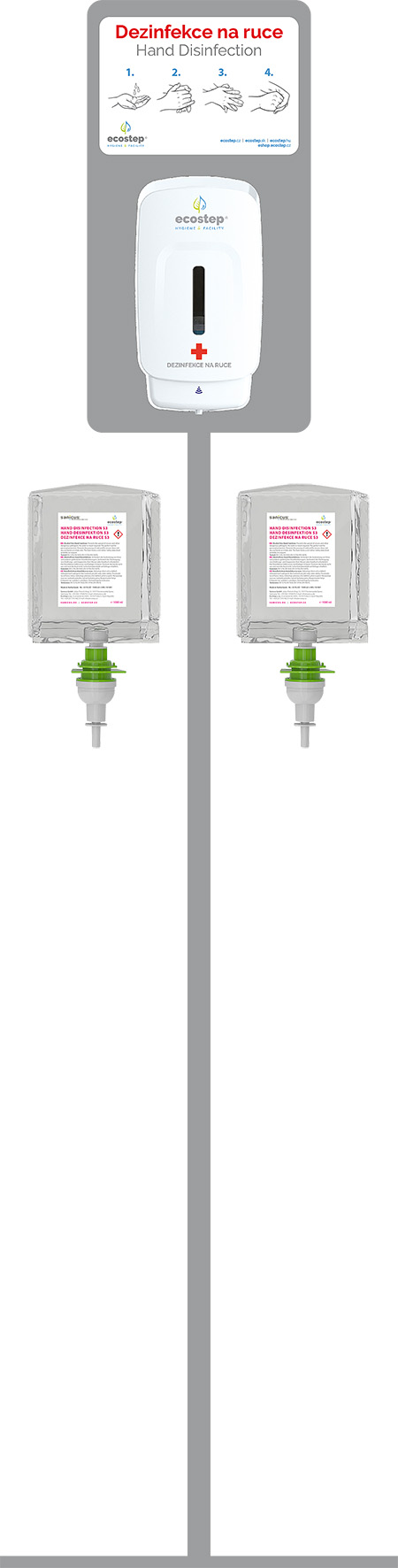 Dezinfekční set S3 obsahuje: stojan, automatický dávkovač S3 a dvě náplně dezinfekce S3 - 6000 dávek