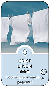 Pocit čerstvě vypraného prádla je zachyceno prostřednictvím svěží okurky, hedvábného jasmínu a náznaku cedrového dřeva. Pocit čerstvě vypraného prádla v nás evokuje pocit čistoty, který může vytvořit perfektní první dojem návštěvníka.