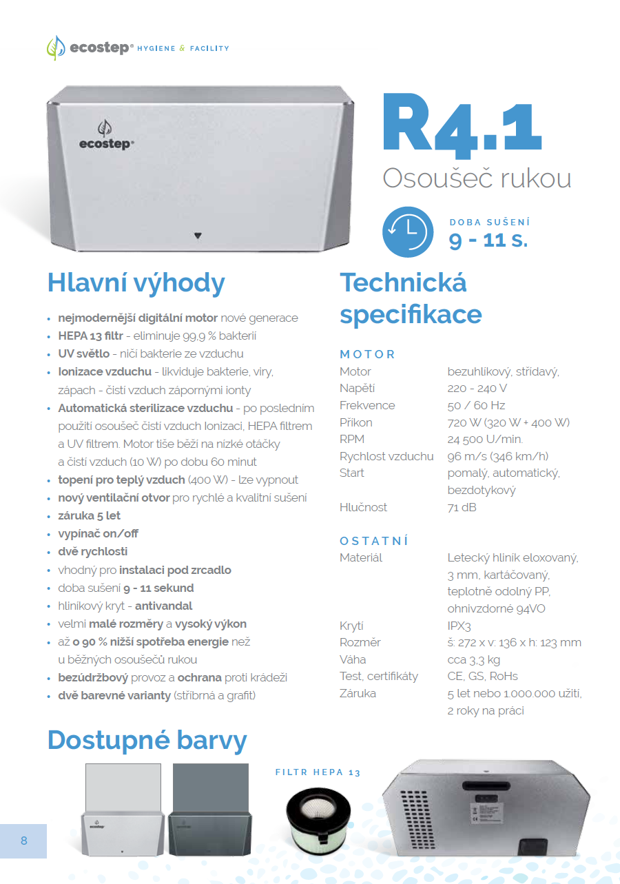 Osoušeč rukou R4.1. je vyroben z kvalitního hliníku, díky čemuž je téměř nerozbitný. Velmi snadno se udržuje, a navíc dokáže ionizovat vzduch a tím jej dále čistí. Celková hygiena je ještě podpořena přítomností filtru HEPA 13, který dokáže zachytit 99,9 % virů a bakterií ve vzduchu.